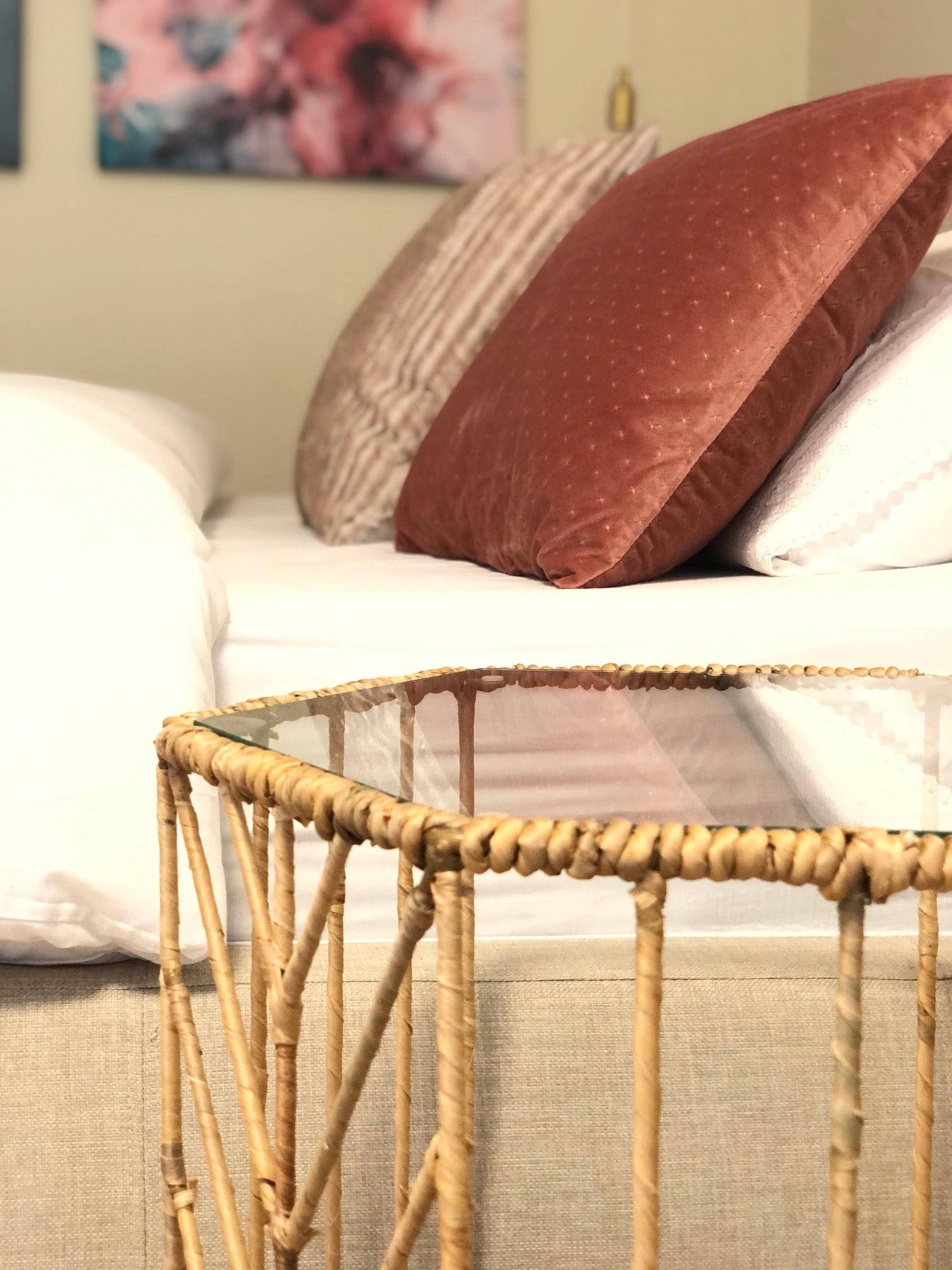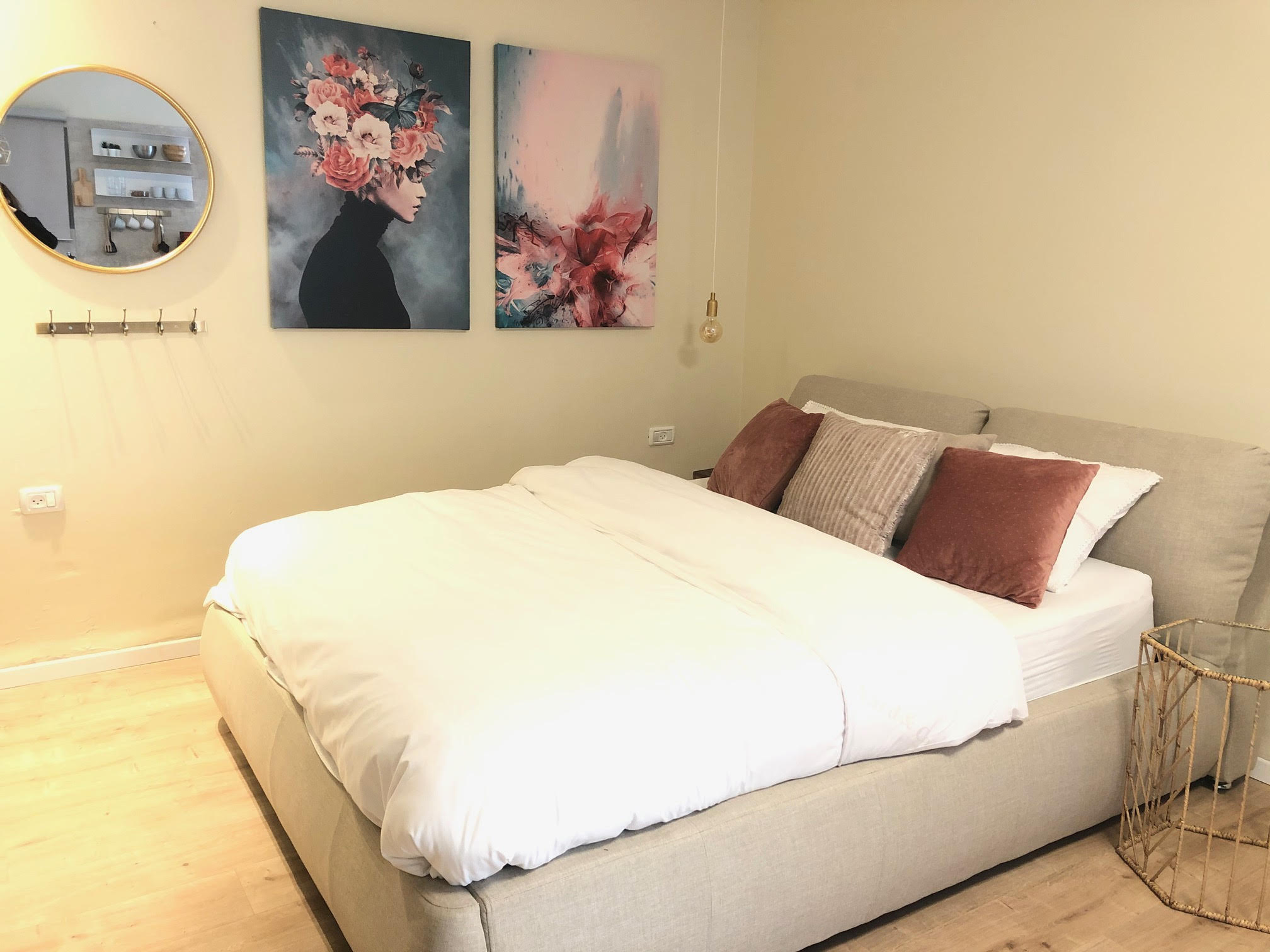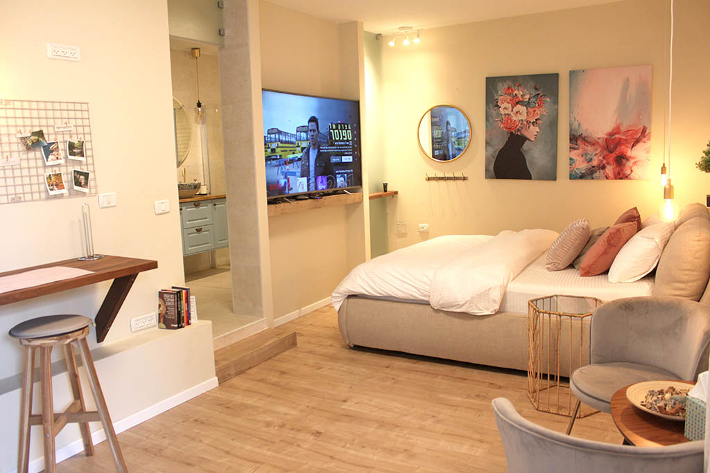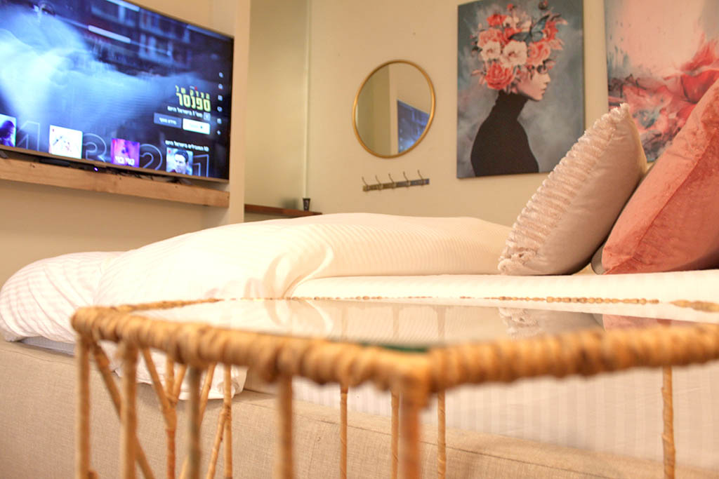 המיטה עם מזרן ויסקו איכותי במיוחד לשינה מדהימה שתאגור כוחות שכל כך היו חסרים לכם לאחרונה. מראה מזהב מעטרת את פינת הטיפוח ועל המדף קרם גוף תוצרת מינרלים ים המלח עם ריח משגע. מול המיטה טלויזיה חכמה 65 אינץ' קעורה תלת מימדית עם נטפליקס מובנה וחופשי בלחיצת כפתור.
