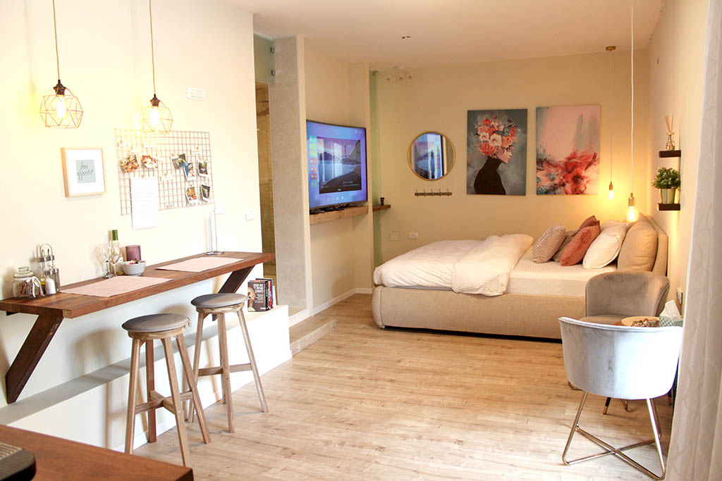 חלל פנים 25 מ"ר | טלויזיה 65 אינץ' | נטפליקס חופשי | מיני בר עשיר | רצפת פרקט חמימה | מזרן ויסקו איכותי | מצעי כותנה 100% | מכונת נספרסו וקפסולות | תמי 4 | מטבח מאובזר | פינת קפה מעוצבת | מוצרי טיפוח וקרמים ים המלח